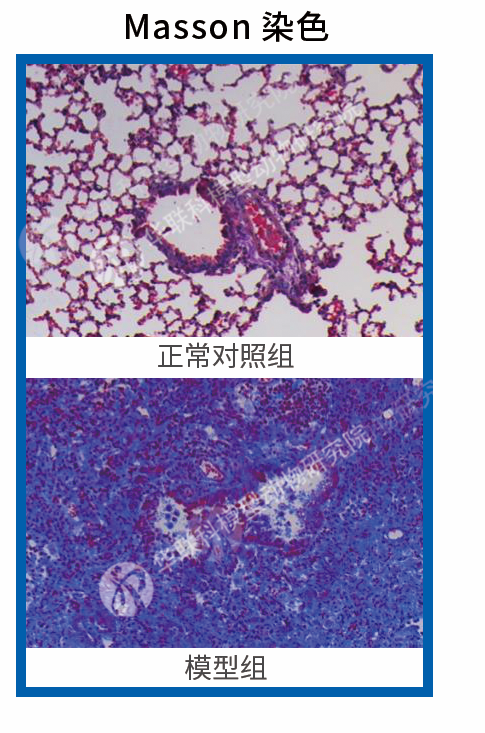 处死动物后取出肺组织,固定、脱水、包埋、切片,行HE染色、Masson染色。HE染色观察肺泡结构破坏程度、炎症细胞浸润范围;Masson染色通过图像分析软件计算胶原沉积面积占肺组织总面积的比例,比例越高表示纤维化越严重。